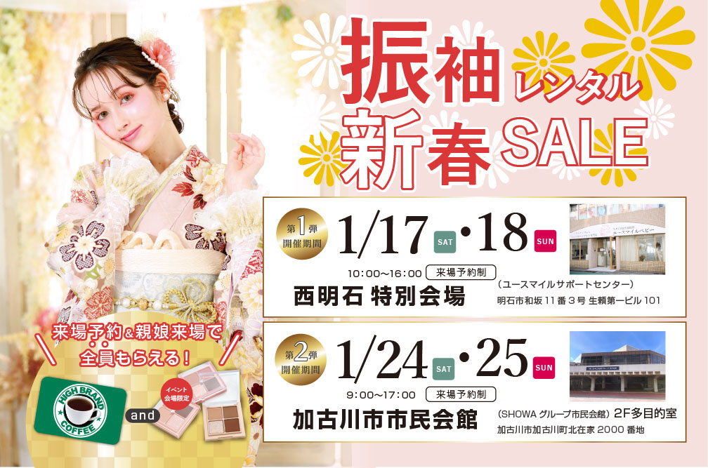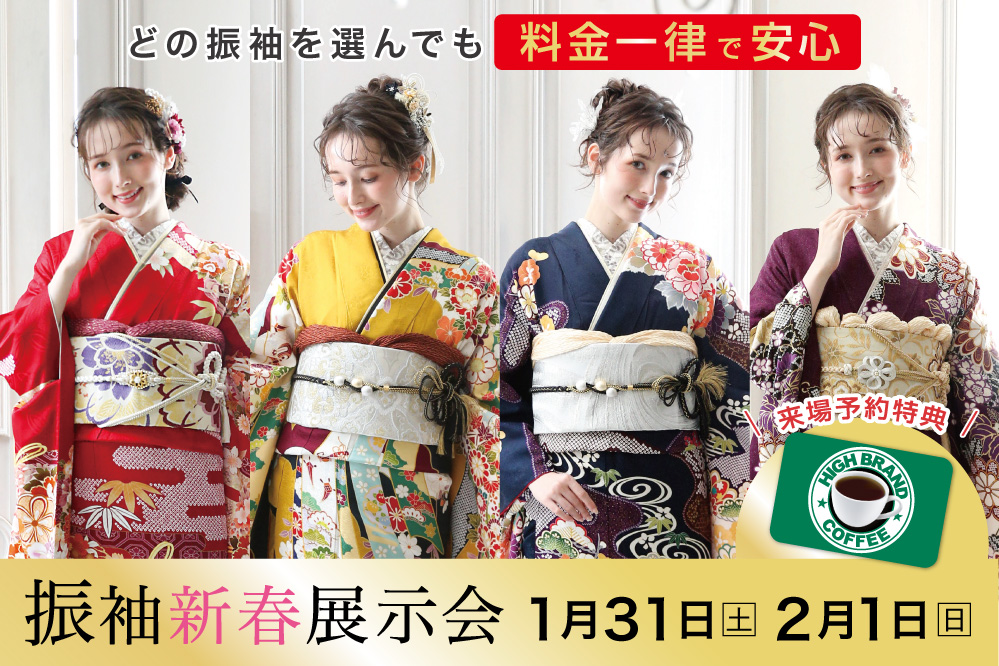 姉妹店ユースマイルと合同で、特別会場での展示会を行います。この日だけの新作振袖も登場!ぜひご来場ください。